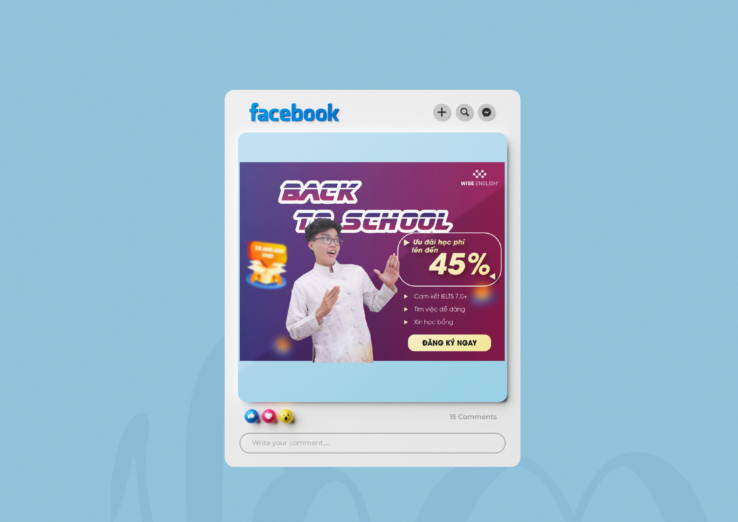 Ấn phẩm “Back to School” được thiết kế dành riêng cho chiến dịch tuyển sinh mùa tựu trường của WISE ENGLISH. Với gam màu tím gradient hiện đại kết hợp cùng hình ảnh sinh động, bài đăng mang lại cảm giác trẻ trung, chuyên nghiệp và thu hút sự chú ý mạnh mẽ trên nền tảng mạng xã hội. Các thông tin ưu đãi như giảm học phí 45%, cam kết đầu ra IELTS hay học bổng được trình bày nổi bật, rõ ràng, giúp tăng tỉ lệ chuyển đổi từ người xem sang hành động đăng ký.