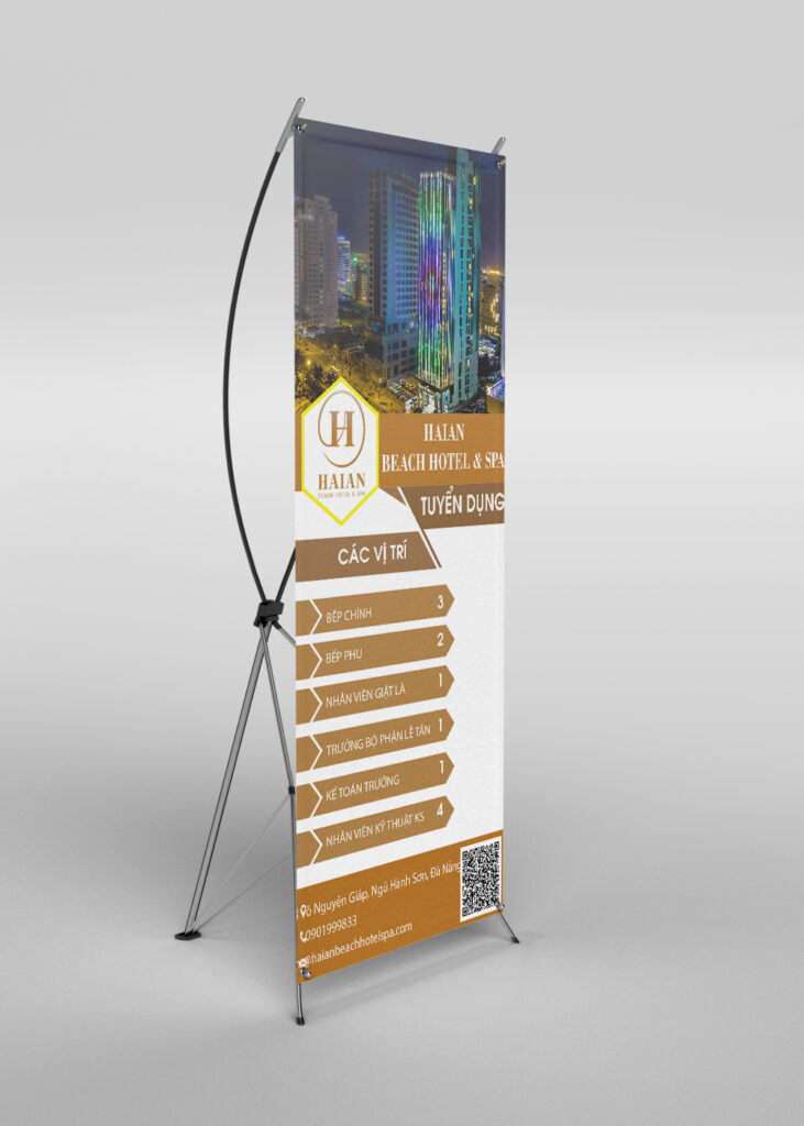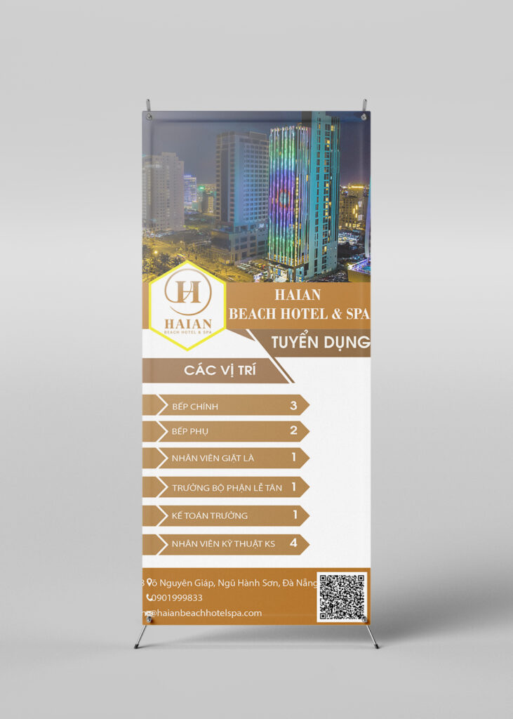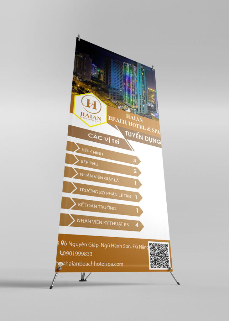 Standee tuyển dụng tại HAIAN Hotel được thiết kế với tinh thần sang trọng, tinh tế nhưng vẫn gần gũi và thu hút, nhằm truyền cảm hứng cho những ứng viên tiềm năng. Tone màu trang nhã, bố cục rõ ràng và hình ảnh chỉn chu giúp HAIAN nổi bật ngay cả giữa không gian đông người – như sảnh tuyển dụng, hội chợ việc làm hoặc khu vực công cộng.