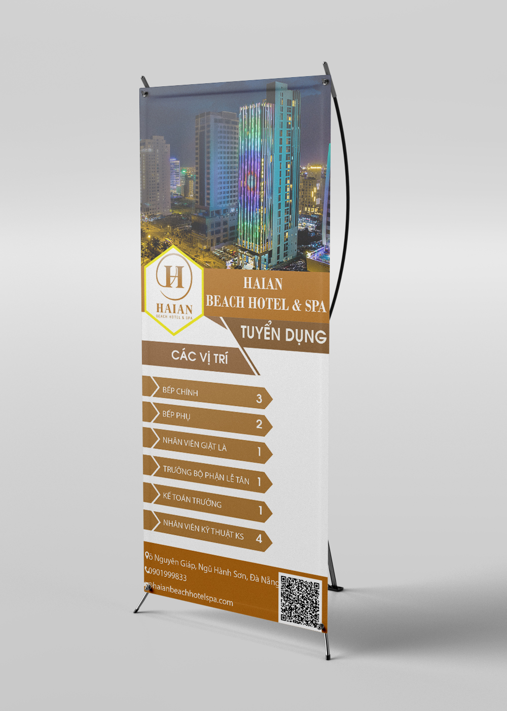 Standee tuyển dụng tại HAIAN Hotel được thiết kế với tinh thần sang trọng, tinh tế nhưng vẫn gần gũi và thu hút, nhằm truyền cảm hứng cho những ứng viên tiềm năng. Tone màu trang nhã, bố cục rõ ràng và hình ảnh chỉn chu giúp HAIAN nổi bật ngay cả giữa không gian đông người – như sảnh tuyển dụng, hội chợ việc làm hoặc khu vực công cộng.